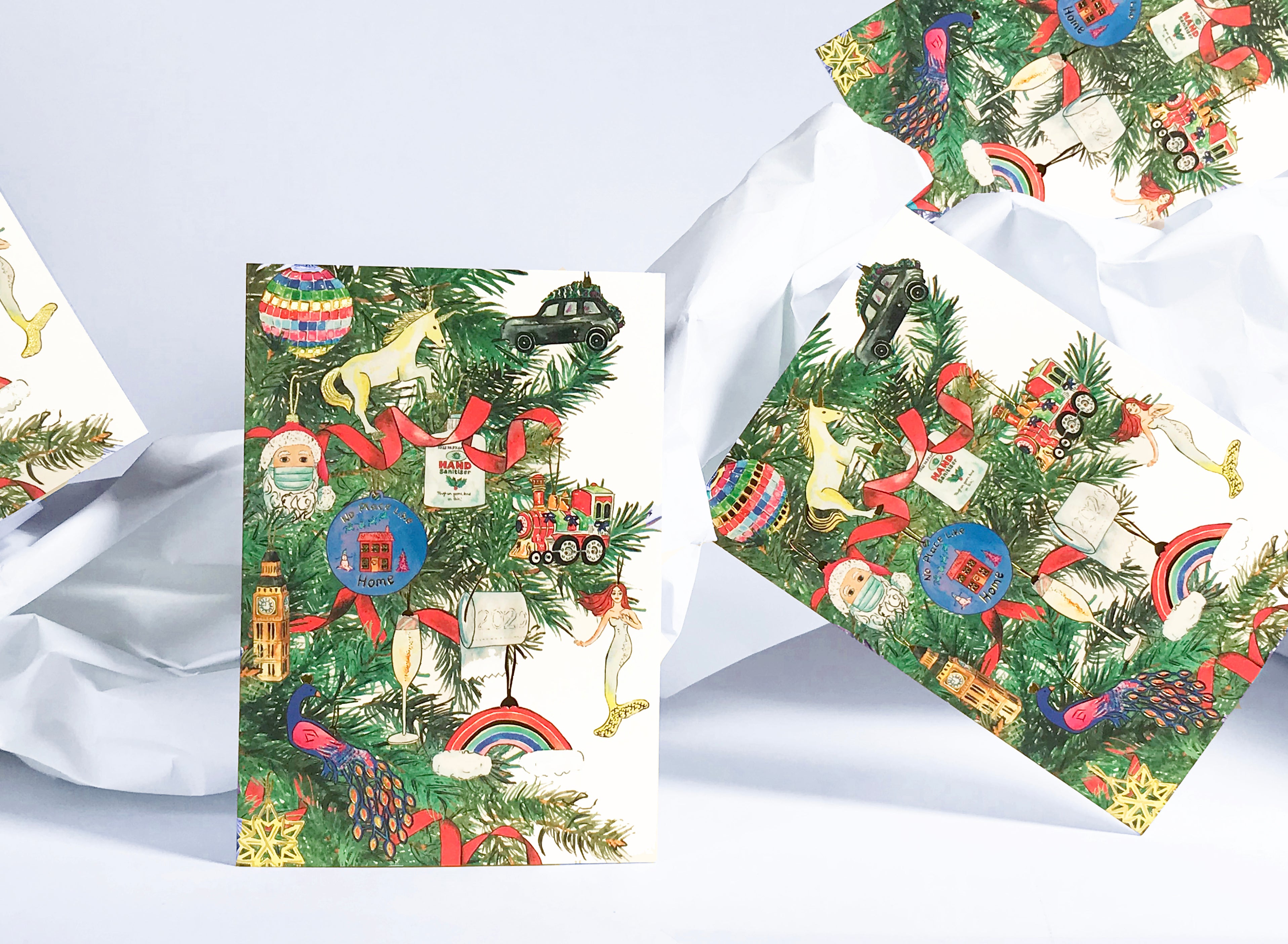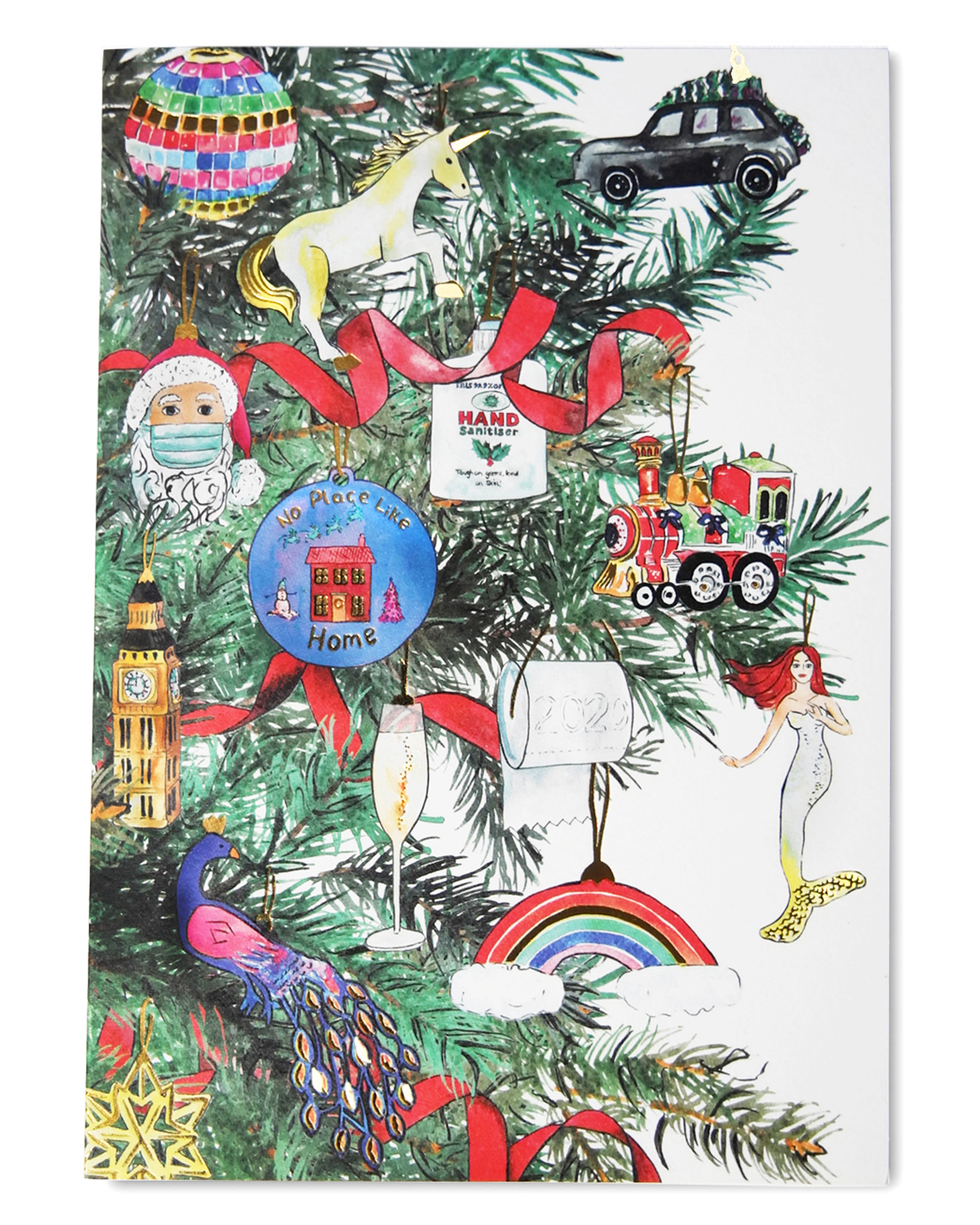 A traditional Christmas tree featured unexpected decorations. A masked santa. A bottle of hand sanitiser. A toilet roll. An NHS rainbow. And a 'Stay Home' bauble. The limited edition cards were printed and intricately foil blocked on a recycled board, manufactured using non-polluting wind-power.
