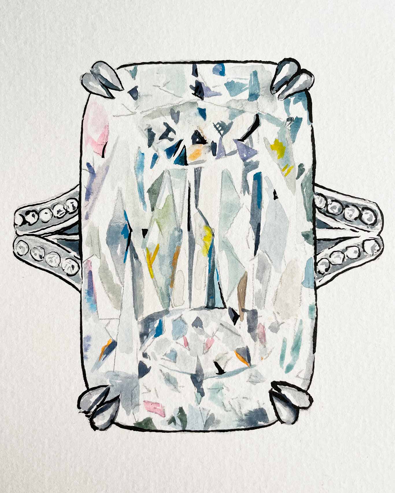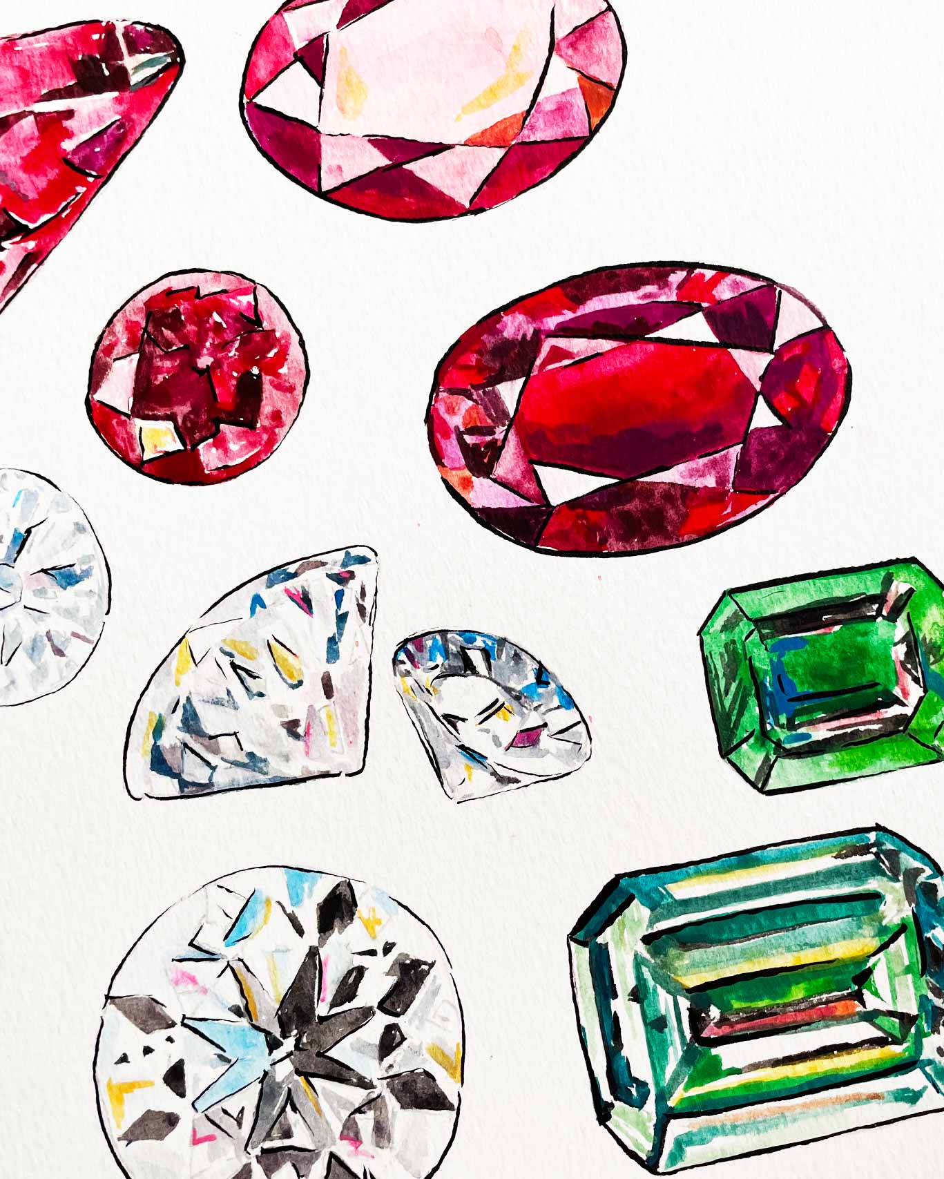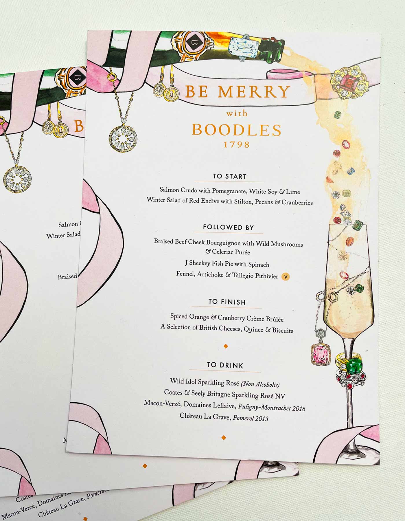 Jo had the great pleasure to create festive celebration stationery for luxury British jewellery brand, Boodles. The Bond Street event set the brief 'Be Merry with Boodles', and the final artwork combined cascading Champagne and glittering jewels.