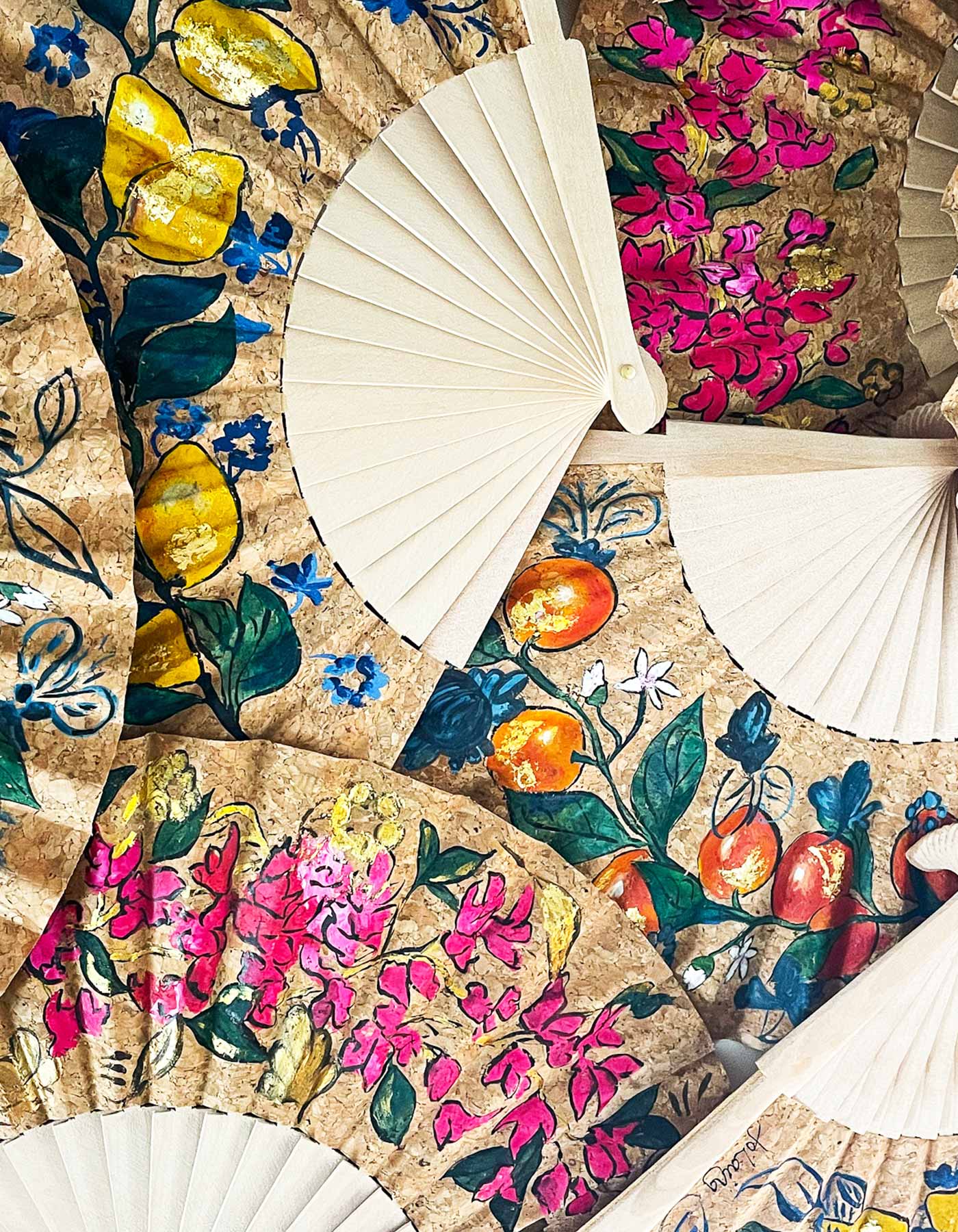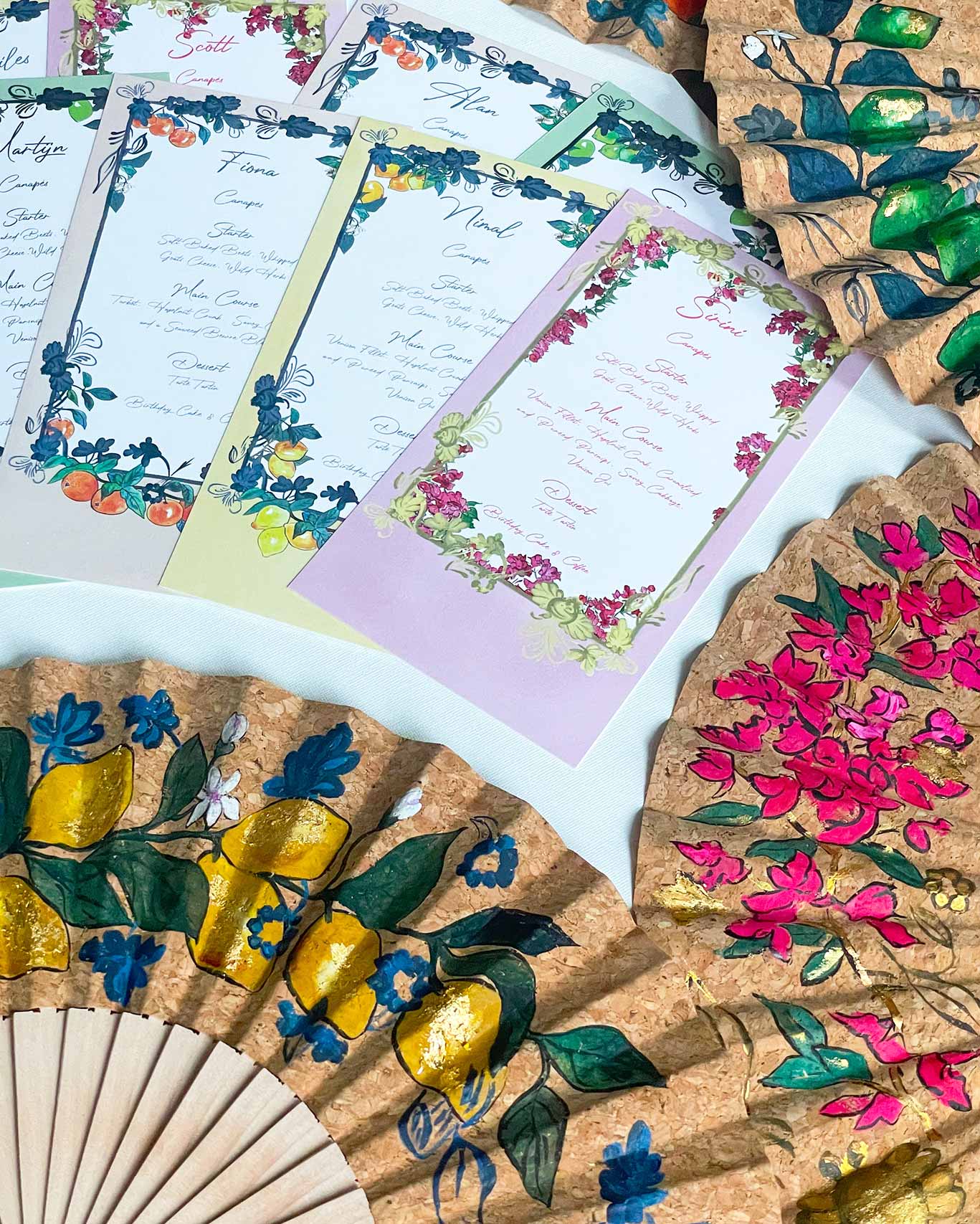 The Quintessentially Elite team commissioned Jo to create a glamorous Italian table setting for a special private event. The suite of stationery included personalised menus inspired by Tuscan ceramics and hand-painted fans, embellished with 24 carat gold leaf.